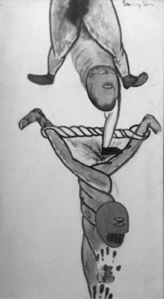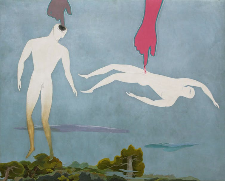 More directly, Circus shows a figure that appears to be powerful, controlling and abusive, and one that is twisted, inverted and powerless. It is striking that Tan’s first queer artwork represents brutal domination. In contrast, many of his later paintings show cavorting, loving and playful same-sex couples.