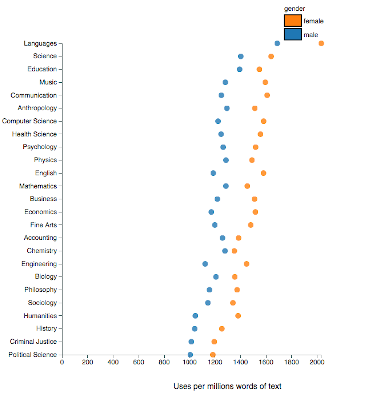These fascinating results are enabled through the work of Assistant Professor Benjamin Schmidt from Northeastern University, who released an interactive chart that groups results from about 14 million reviews over a couple of months from RateMyProfessors. It’s easy to use: type in the word and the results will be graphed, split by gender across discipline and per million words.