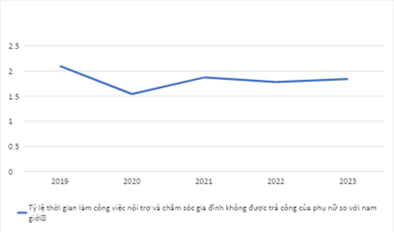 Trong xu thế hội nhập và phát triển, bình đẳng trong công việc chăm sóc không trả công là một trong những chủ đề được sự quan tâm của nhiều người, nhiều tổ chức, nhiều quốc gia. Kết quả số liệu điều tra lực lượng lao động ở Việt Nam năm 2019 cho thấy, phụ nữ dành 2,69 giờ mỗi ngày để làm công việc chăm sóc không được trả lương, trong khi nam giới chỉ dành 1,28 giờ mỗi ngày để thực hiện những công việc này. Tuy nhiên, năm 2020, sự chênh lệch về thời gian làm công việc nội trợ và chăm sóc gia đình không được trả phí giảm xuống, theo đó, nữ mất 2,47 giờ/ngày và nam giới là 1,60 giờ/ngày. Năm 2021, trước tác động tiêu cực của đại dịch Covid-19, do áp dụng chính sách giãn cách xã hội, người lao động làm việc tại nhà, nên phụ nữ vừa phải đảm nhận công việc công ty/cơ quan của mình, và thời gian thực hiện các công việc chăm sóc gia đình chắc chắn tăng lên. Theo kết quả điều tra lực lượng lao động năm 2021, phụ nữ dành 2,51 giờ/ngày và nam giới dành 1,34 giờ/ngày để làm những công việc nội trợ và chăm sóc gia đình không được trả phí, số liệu này vào năm 2022 với nữ và nam lần lượt là 2,35 giờ/ngày và 1,32 giờ/ngày. Theo kết quả số liệu của module mở rộng từ điều tra lao động việc làm năm 2023, số giờ trung bình làm công việc nội trợ và chăm sóc trong gia đình không được trả công của nữ giới là 16,13 giờ/tuần, nam giới là 8,75 giờ/tuần. Kết quả này cho thấy nỗ lực về việc giảm số giờ trung bình làm công việc chăm sóc không được trả công của phụ nữ đã được quan tâm, tuy nhiên vẫn có những thay đổi giữa các năm. Hiện chỉ tiêu này chưa đạt được so với các mục tiêu đề ra năm 2025.